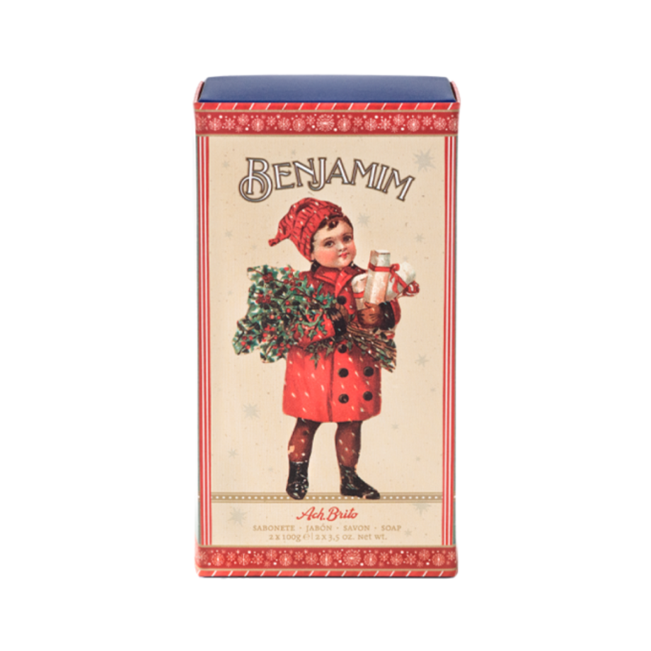 Ach Brito Benjamim Tvålbox är inspirerad av klassiska barnböcker och deras lekfulla, oskuldsfulla värld. Detta set innehåller två väldoftande tvålar tillverkade på en vegetabilisk bas berikad med olivolja, vilket ger en uppfriskande doftupplevelse. Tvålarna tillverkas på traditionellt sätt i Portugal och erbjuder en doftkombination av frisk tall, gröna bergsörter, olivträdets varma toner och basilika med en hint av tomatbladens livskraft. Egenskaper: Skonsam för huden Frisk, naturlig doft med örtiga och träiga noter Presentförpackning med två tvålar SPECIFIKATIONER: 2 x 100 g