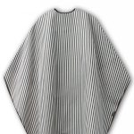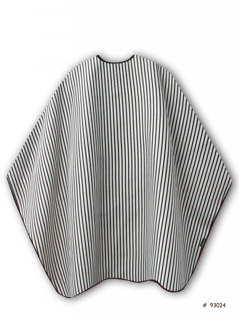 En snygg svart och vitrandig frisörkappa i helt rätt barber stil, den här kappan är alltid rätt. Kappan är extra stor för att kunna användas på även fullvuxna män men kan självklart justeras för att passa även dem som är lite mindre med hjälp av de 6 justeringsknapparna.