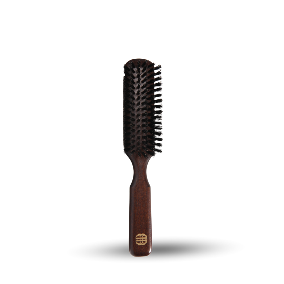 En stilig borste i wengéträ med naturborst (svin) som tämjer det mest bångstyriga håret. Ganska styva borst som drar igenom stråna väl och skapar bra cirkulation i skalpen. Mycket hög kvalitet på både borste och skaft. Benjamin Barbers logga i guld på skaftet. Total längd: 21 cm Bredd: 3,1 cm Rengöring: Ta bort lösa hårstrån varje dag. Tvätta borsten för hand med vatten och tvål eller schampo. OBS: Borsten får inte blötläggas. Låt lufttorka. Får inte placeras ovanpå element eller ugn.