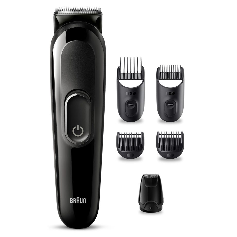 Trimma skägget och ansiktet med Braun All-In-One Styling Kit Serie 3. 6-i-1-groomingkit för skägg, hår, detaljer och mer. Med ultravassa blad och 50 minuters drifttid.Lådan innehåller:1x trimmerenhet inkl. trimmerhuvud av plast1x minifolierakapparat 1x skjutbar skäggkam (3-11 mm) 1x skjutbar hårkam (13-21 mm) 1x standard fast kam (1 mm)1x standard fast kam (2 mm)1x rengöringsborste Braun Styler MGK3410 Black
