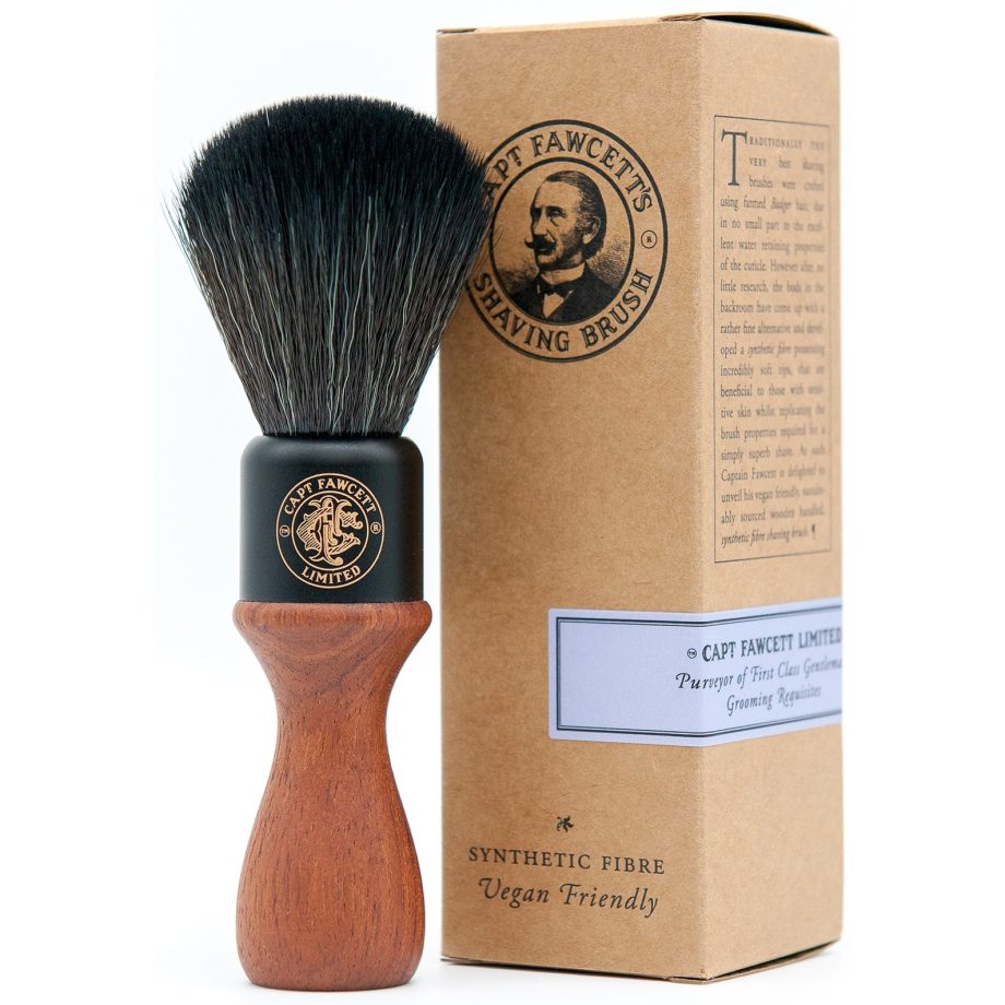 Captain Fawcett Syntethic Fibre Shaving Brush Wooden Handle är en rakborste med syntethår, tillverkad i klassisk old school design med trähandtag. Syntetfibrer av allra högsta kvalitet med samma egenskaper och mjukhet som Silvertip Badger. Fibrerna torkar snabbare än naturligt hår och blir därför mer slitstarkt. Dessa har hög uppsugningsförmåga och ger ett krämigt lödder. Passar även bra för dig med lite känsligare hud. Veganvänlig. SpecifikationDiameter: 45 mmBorstlängd: 52 mmLängd: 134 mmDiameter handtag: 17-29 mmVikt: 59 gAnvändning:Fukta rakborsten med varmt vatten och skaka av överflödet. Arbeta upp raklädder med cirkulära rörelser. Skölj noga med ljummet vatten för att rengöra rakborsten. Vid behov kan du göra rent den med ett milt schampo. Tänk på att rakborsten ska hängas upp och ner eller läggas på sidan för att torka. Captain Fawcett Syntethic Fibre Shaving Brush Wooden Handle