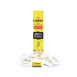 Storpack skarpa rakblad för den traditionella säkerhetshyveln (safety razor) från japanska Feather. Tillverkade i rostfritt stål med platinum-coating för bästa hållbarhet. Passar till alla säkerhetshyvlar, t.ex. Merkur. Används även till shavetter avsedda för korta rakblad, och knäcks då först försiktigt på mitten. Den här produkten innehåller 20 st 10-pack Feather dubbelrakblad. Priset ger dig 20 st 10-pack för priset av 18 st 10-pack. Gents rekommenderar denna produkt för att: Dessa japanska rakblad är de vassaste som finns att tillgå på marknaden, trots det kostar de inte mer än andra rakblad. Det tycker vi gör Feather värda en rekommendation.