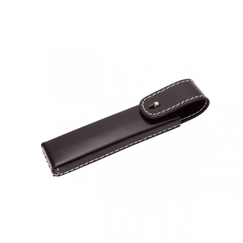 Ett elegant och tåligt fodral till rakkniv i svart sadelläder med kaxiga vita stygn. Plats för förvaring av en rakkniv / Shavette. Perfekt för resan och säker förvaring i badrumsskåpet. SPECIFIKATIONER: Längd: 17 cm Tillverkat i Tyskland