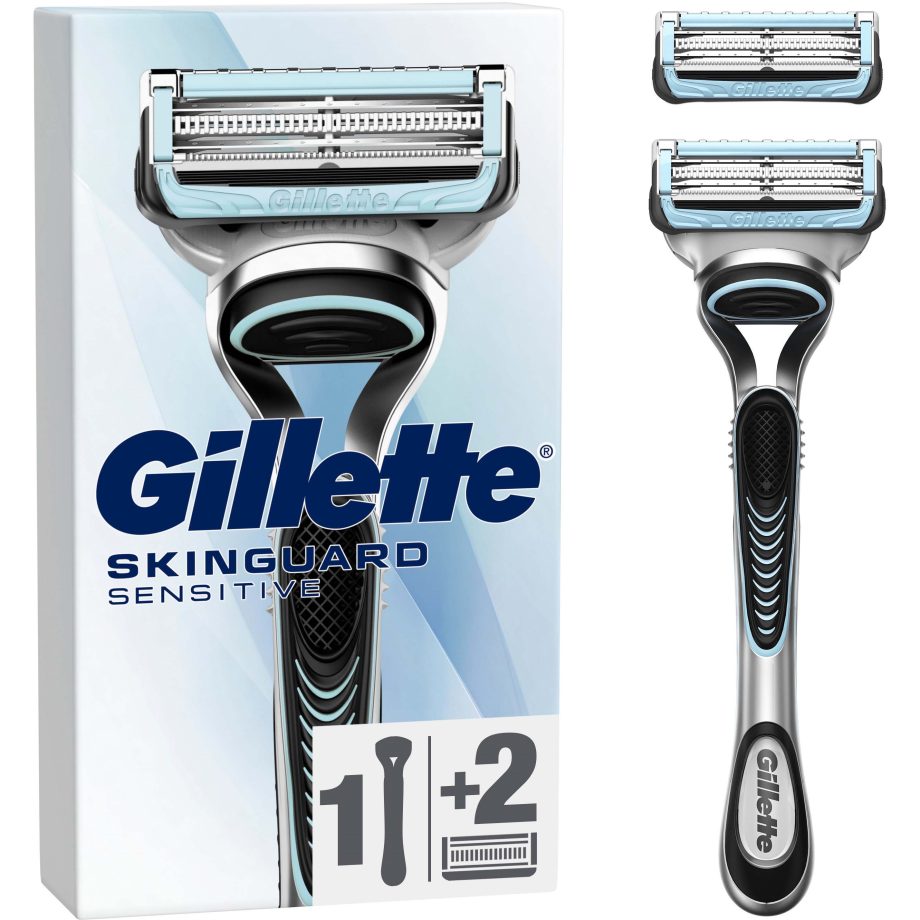 Gillette SkinGuard Sensitive rakhyvel för män är utformad för att raka över knottror och utslagsbenägen hud. Den unika SkinGuard-tekniken skyddar huden mot rakbladen och bidrar till att minska irritation. Dessutom hjälper de två lågkraftiga skärbladen till att minska ryck och slit.Den unika SkinGuard-teknologin bidrar till att skydda knottror och hud som lätt drabbas av utslag genom att minska hudkontakten med rakbladenMinimerar kontakt mellan rakblad och lättirriterad hud för att minska irritationPrecisionstrimmer: på baksidan lämpar sig perfekt för svåråtkomliga områden och för att styla ansiktshårEn refill räcker upp till en månads rakningarSmörjande remsa på båda sidor om bladen för ett skyddande glid Gillette SkinGuard Sensitive Men’s Razor 1 Handle 2 Blade Refills