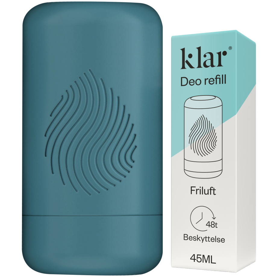 Klar Roll-on behållareRoll-on behållare för påfyllningsbar deodorant i färgen Blågrön. Varför slänga något du kan använda om och om igen? Den här deodoranten kan du fylla på när den är tom. Genom att köpa en refill istället för en ny roll-on sparar du 85% plast. Behållaren är tom, så kom ihåg att köpa refill med önskad doft.Användning:Använd Klar Roll-on behållare tillsammans med en valfri Klar Deo Refill. Bryt av toppen av påfyllningsröret, placera den i behållarens öppning och fyll på. Applicera deodoranten på ren och torr hud. Låt torka innan du klär på dig. Undvik kontakt med skadad eller irriterad hud. Sluta använda om utslag eller irritation uppstår.Klar Deo Refill FriluftKlar Friluft Deo Refill är en påfyllningsbar deodorant som har en ren och mer maskulin doft som påminner om den skandinaviska friluften vid fjord och hav. Perfekt för aktiva äventyrare – och dagdrömmare. Effektiv mot svett och dålig lukt. Dermatologiskt testad på känslig hud. Miljömärkt och vegan.Användning:Använd Klar Deo Refill tillsammans med en valfri Klar Roll-on-behållare. Bryt av toppen av tuben, placera den i behållarens öppning och fyll på. Applicera deodoranten på ren och torr hud. Låt torka innan du klär på dig. Undvik kontakt med skadad eller irriterad hud. Sluta använda om utslag eller irritation uppstår.45 ml Klar Maskulin Duo