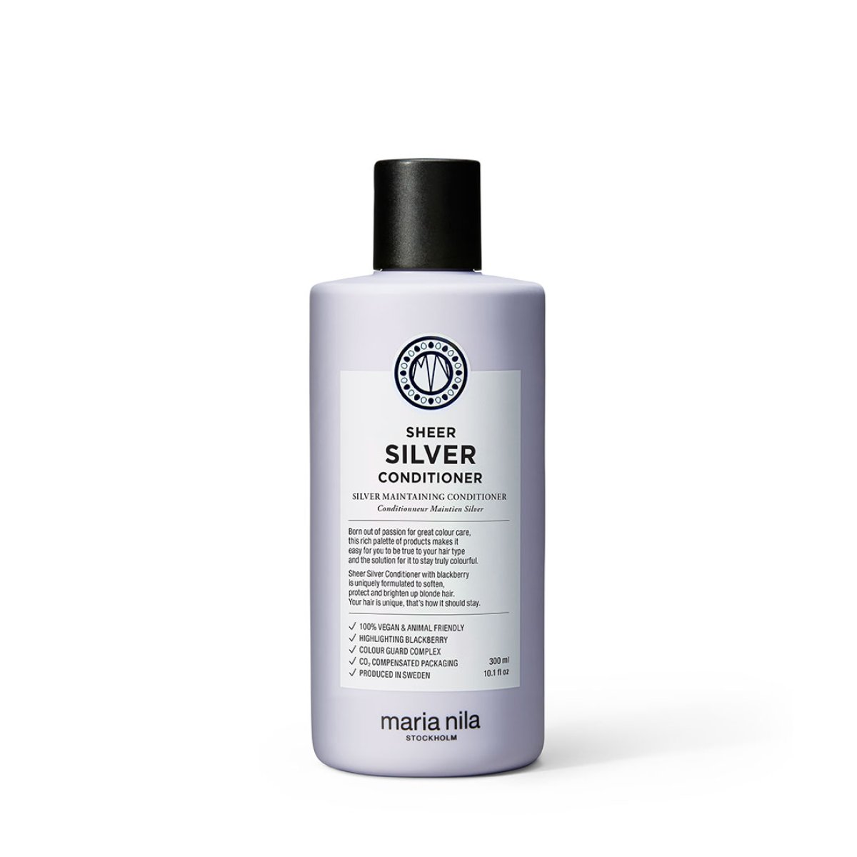 Ett balsam för blont hår som gör håret lätt att reda ut, mjukgör, återfuktar och stärker hårets struktur. Innehåller violett pigment och björnbärsextrakt som bidrar till att neutralisera gula toner. Håret får lyster och hårstrukturen stärks. Med Color Guard Complex som skyddar och bevarar färgen i färgbehandlat hår. Fritt från sulfater och parabener. Användning: Applicera efter tvätt med Sheer Silver Shampoo, låt verka i ett par minuter och skölj. Använd handskar för att undvika missfärgning och irritation. Produkten innehåller ingredienser som kan orsaka hudirritation hos vissa personer och det rekommenderas att man utför allergitest innan användning. Volym: 100 ml, 300 ml, 1000 ml. 1000 ml flaskan har en praktisk pump.