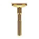 Justerbar säkerhetshyvel från tyska Merkur i guldbelagt stål. Tack vare det justerbara systemet kan man ställa vinkeln på rakbladshuvudet i sex olika nivåer. Börja på 1 och när du har lärt dig tekniken (minst 1-2 månader) kan du gå vidare till nästa steg osv. Tanken är inte att du måste upp till högsta steget utan snarare hitta den inställning som ger dig en riktigt nära men ändå behaglig rakning. Kraftig och pålitlig design gjord för att användas hela livet. Vikt: 125 gram Längd: 110 mm Bredd: 50 mm Handtag diameter: 13 mm Till denna hyvel ska du använda dubbelsidiga rakblad. Ett dubbelblad varar upp till tre gånger så länge som vanliga rakblad med 3-bladssystem. Ett Merkur Super Platinium rakblad ingår vid köpet av hyveln. Här hittar ett resefodral till din säkerhetshyvel.