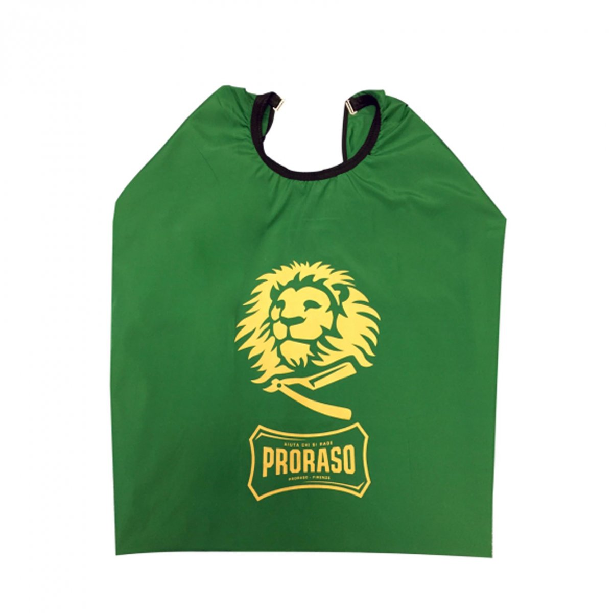 En barberarkappa som skyddar kläder vid barbering eller hårklippning. SPECIFIKATIONER: One-size. Fästs med ett metalspänne i nacken. Kappan är grön med Prorasos logga tryckt i guld.