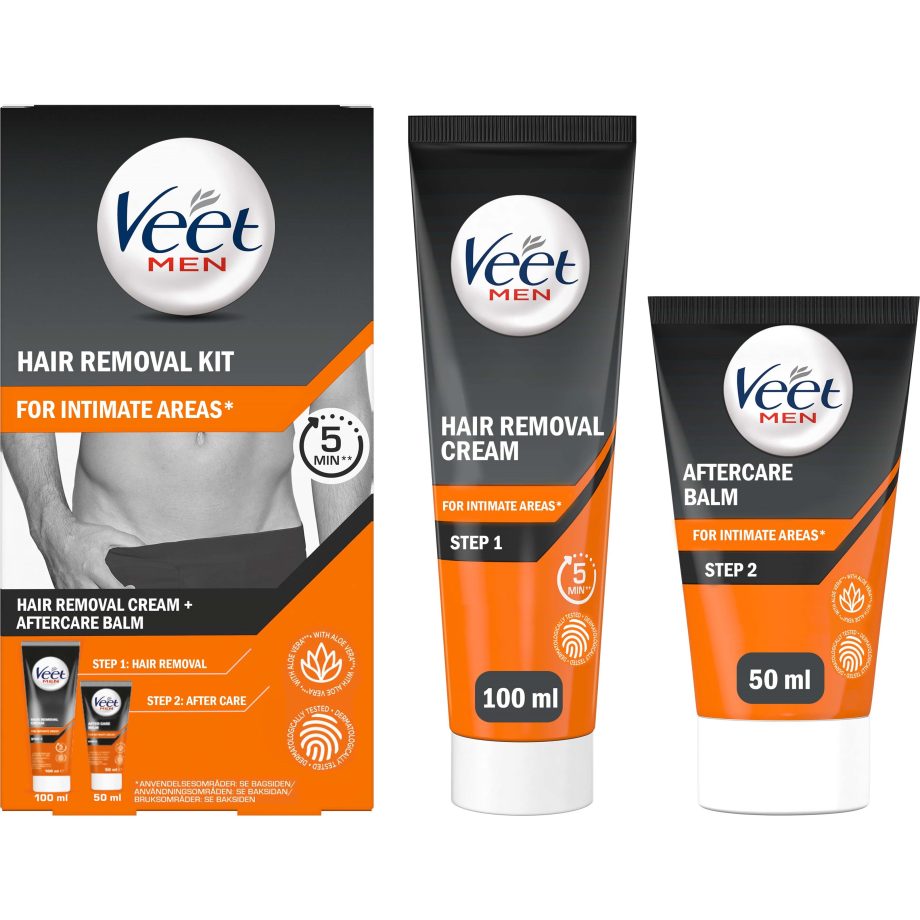 Veet Man Intimate Hair Removal Kit innehåller en hårborttagningskräm och Aftercare Balm för män, framtaget för intima kroppsområden. Kan användas för känsliga områden för att ta bort pubeshår, hår på ljumskarna, vid penisroten, på pungen och på skinkorna, samt armhålor, bröst och kropp. Hårborttagnings-kitet för intimområdet innehåller en hårborttagningskräm och en Aftercare Balm som noggrant testats under kontroll av hudläkare. Hårborttagningskrämen kan användas för att depilera vissa delar av det intima kroppsområdena, och Aftercare Balmet hjälper till att göra huden återfuktad och lugnad efter hårborttagning.Användning:Verkar på 5*– 10 minuter1) Läs säkerhetsinformationen och alla anvisningar innan du använder produkten och följ dem noga.2) Hårborttagningskrämen lämpar sig för borttagning av pubeshår och hår på ljumskar, vid penisroten, på pungen och på skinkorna. Använd inte hårborttagningskrämen på penisskaftet eller ollonet, mellan skinkorna, runt anus eller det perianala området.3) Om du använder produkten för första gången kan det underlätta att först trimma håret till ca 2 cm längd.4) Använd händerna eller den böjda delen av spateln för att applicera hårborttagningskrämen jämnt på huden å att behåringen täcks helt. Skölj händerna med vatten direkt efteråt.5) Låt hårborttagningskrämen sitta kvar 5 minuter på huden och använd sedan spateln eller en fuktad tvättlapp för att försiktigt skrapa av krämen på ett litet testområde. Håll huden spänd medan du skrapar. Om håret lossnar lätt använder du spateln eller en fuktad tvättlapp för att ta bort resten av krämen. Om håret sitter kvar kan du låta krämen sitta i upp till 10 minuter totalt – men inte längre. Om du upplever smärta/sveda eller stickningar i huden under användningen ska du omedelbart torka bort produkten med en fuktad tvättlapp och sedan skölja noga så att du får bort all kräm.6) Skölj huden noga med vatten för att få bort all kräm helt och torka dig sedan varsamt.7) Applicera Aftercare Balm på samma sätt som en fuktkräm, genom att massera in den varsamt i huden.*5 minuter gäller endast hårborttagningskrämen. Den börjar verka efter 5 minuter. Veet Man Intimate Kit 150 ml